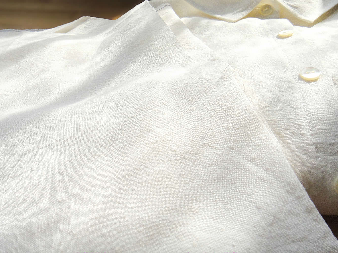 この生地は、原材料がフラックス(亜麻)のみの、リネン100%です。生地の色は、若干自然な黄色みを帯びたオフホワイトで、おだやかな日差しのようなやさしい印象があります。また、しっとりとした適度な重みや張りが存在感や落ち着き、ここちよさを感じさせ、生地に上品さを加えています。