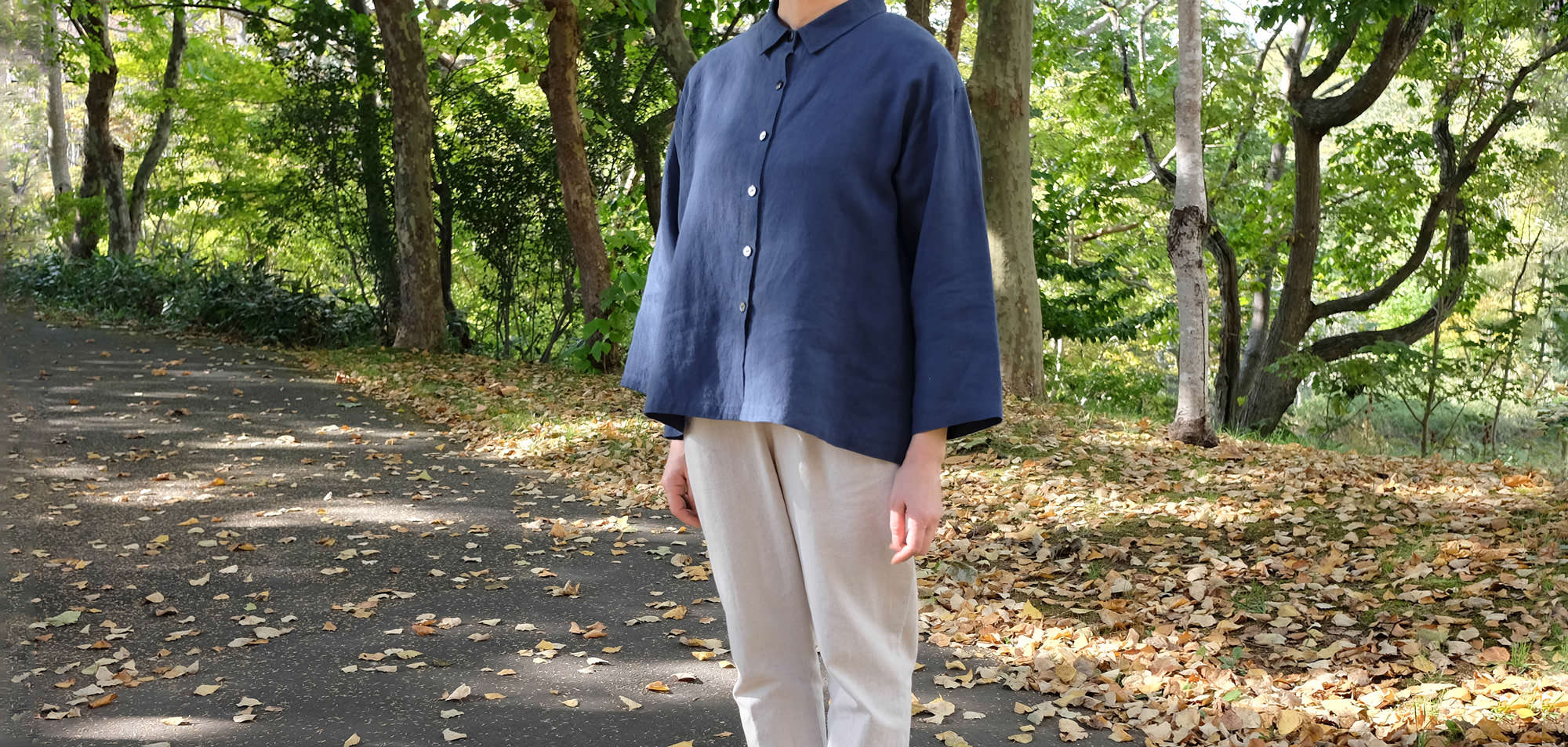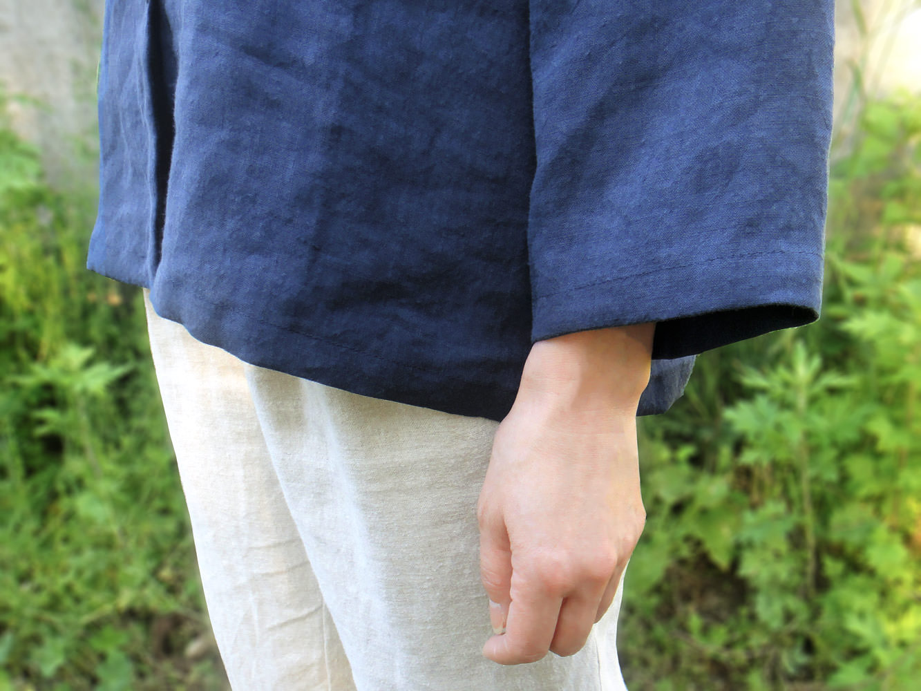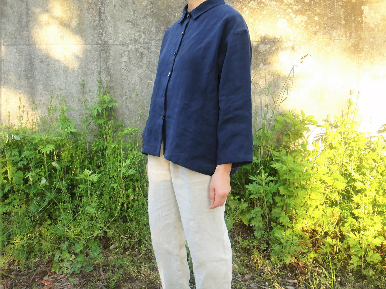 この生地は、原材料がフラックス(亜麻)のみの、リネン100%です。生地の色は、藍染めのような少し渋めの紺色です。黒すぎず落ち着いていて、秋ののどかな木陰のような印象があります。また、しっとりとした適度な重みや張りが存在感や落ち着き、ここちよさを感じさせ、生地に上品さを加えています。