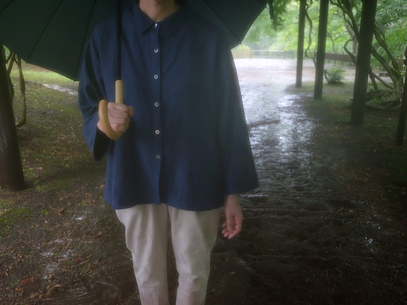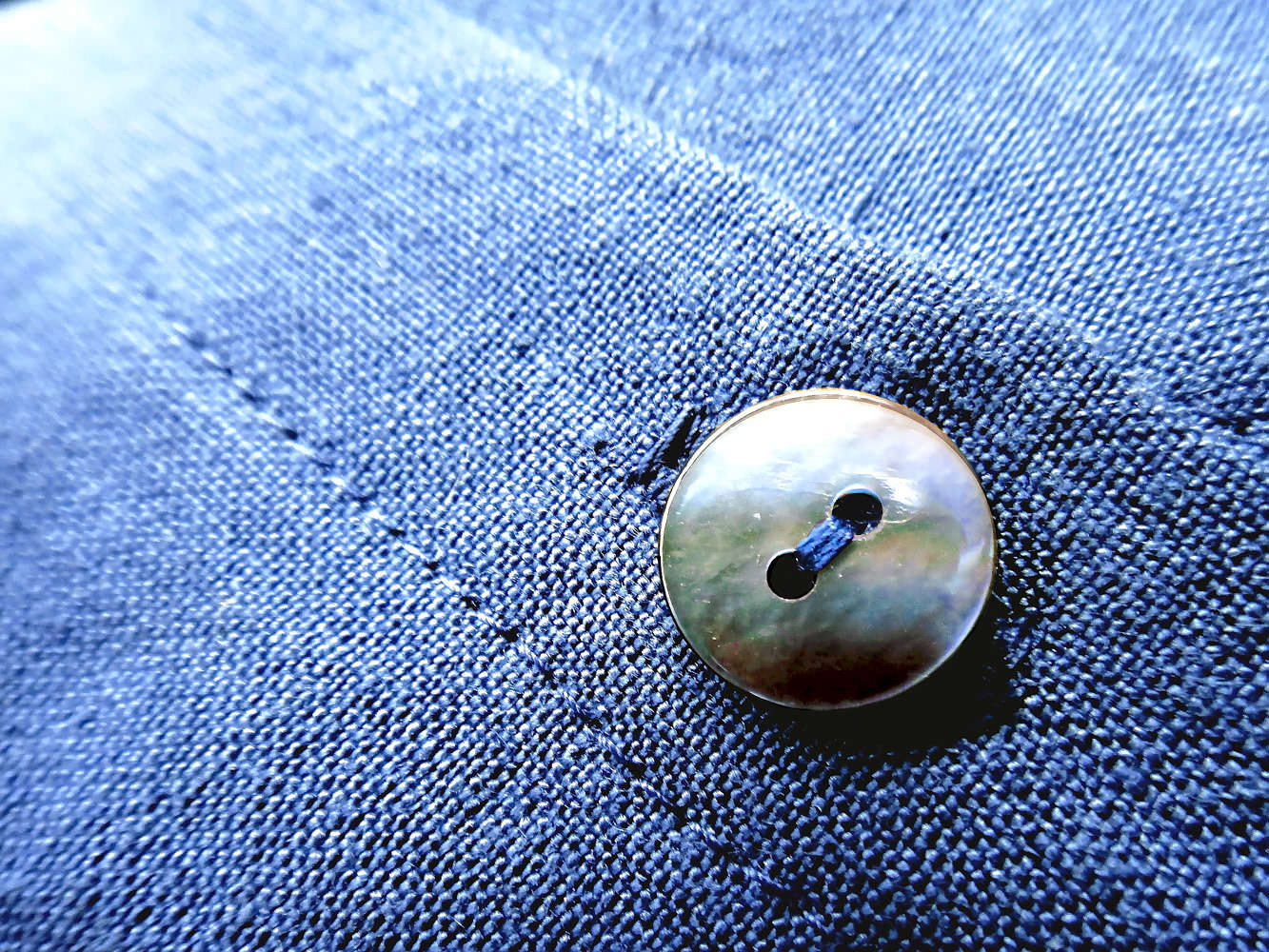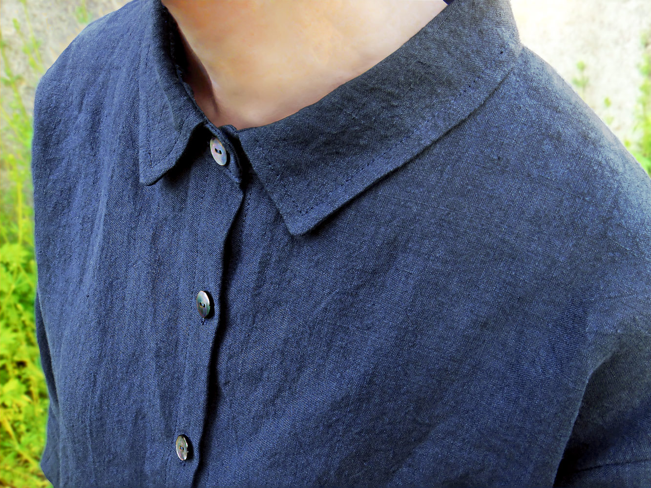 この生地は、原材料がフラックス(亜麻)のみの、リネン100%です。生地の色は、藍染めのような少し渋めの紺色です。黒すぎず落ち着いていて、秋ののどかな木陰のような印象があります。また、しっとりとした適度な重みや張りが存在感や落ち着き、ここちよさを感じさせ、生地に上品さを加えています。